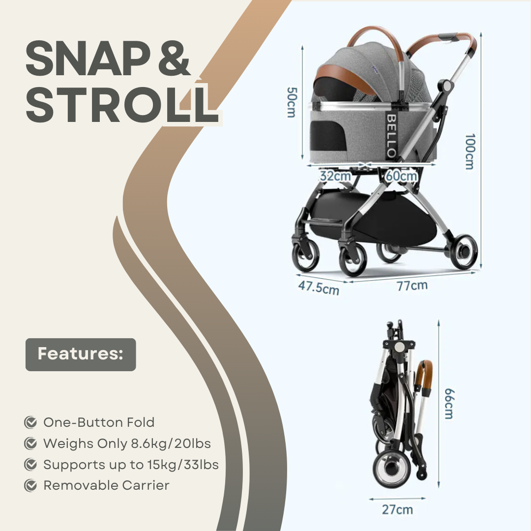Ideal for outdoor travel, this multi-purpose stroller doubles as a pet's private car. Enjoy the luxury of seamless transitions from strolling to storing, all with effortless ease.